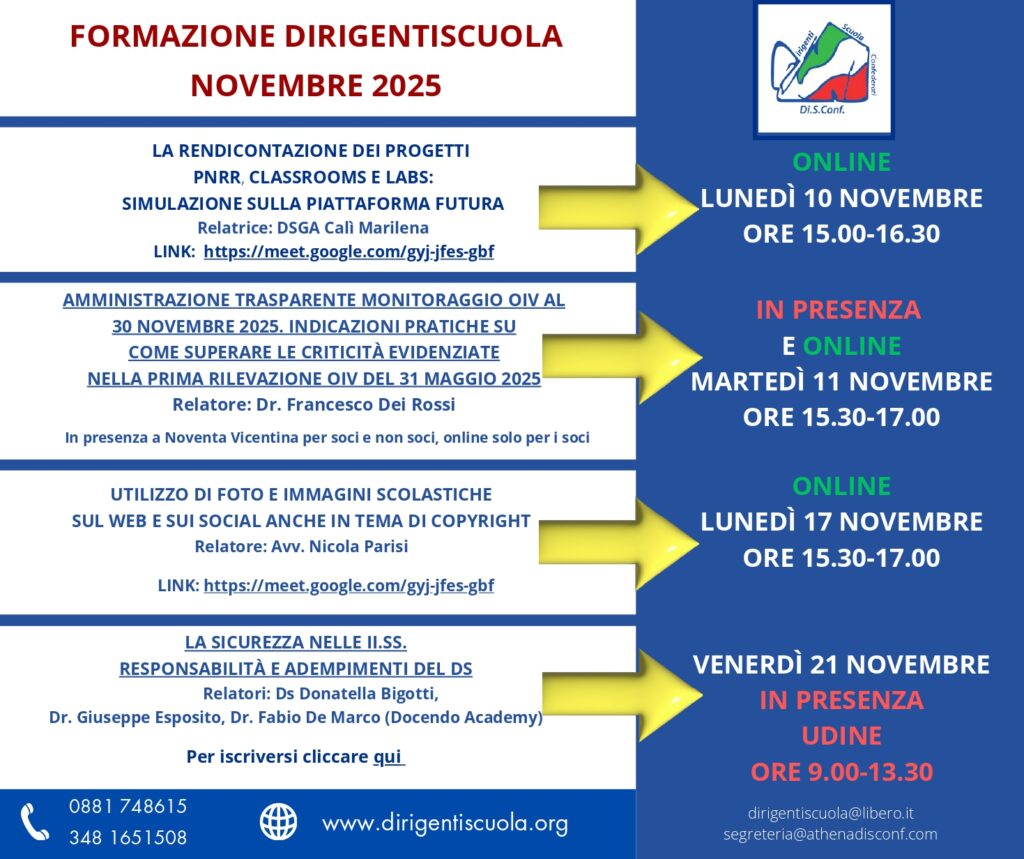 Se ottobre è stato un mese ricco di occasioni formative targate DIRIGENTISCUOLA, novembre non è da meno con un calendario già molto fitto di appuntamenti su tematiche di sicuro interesse.
