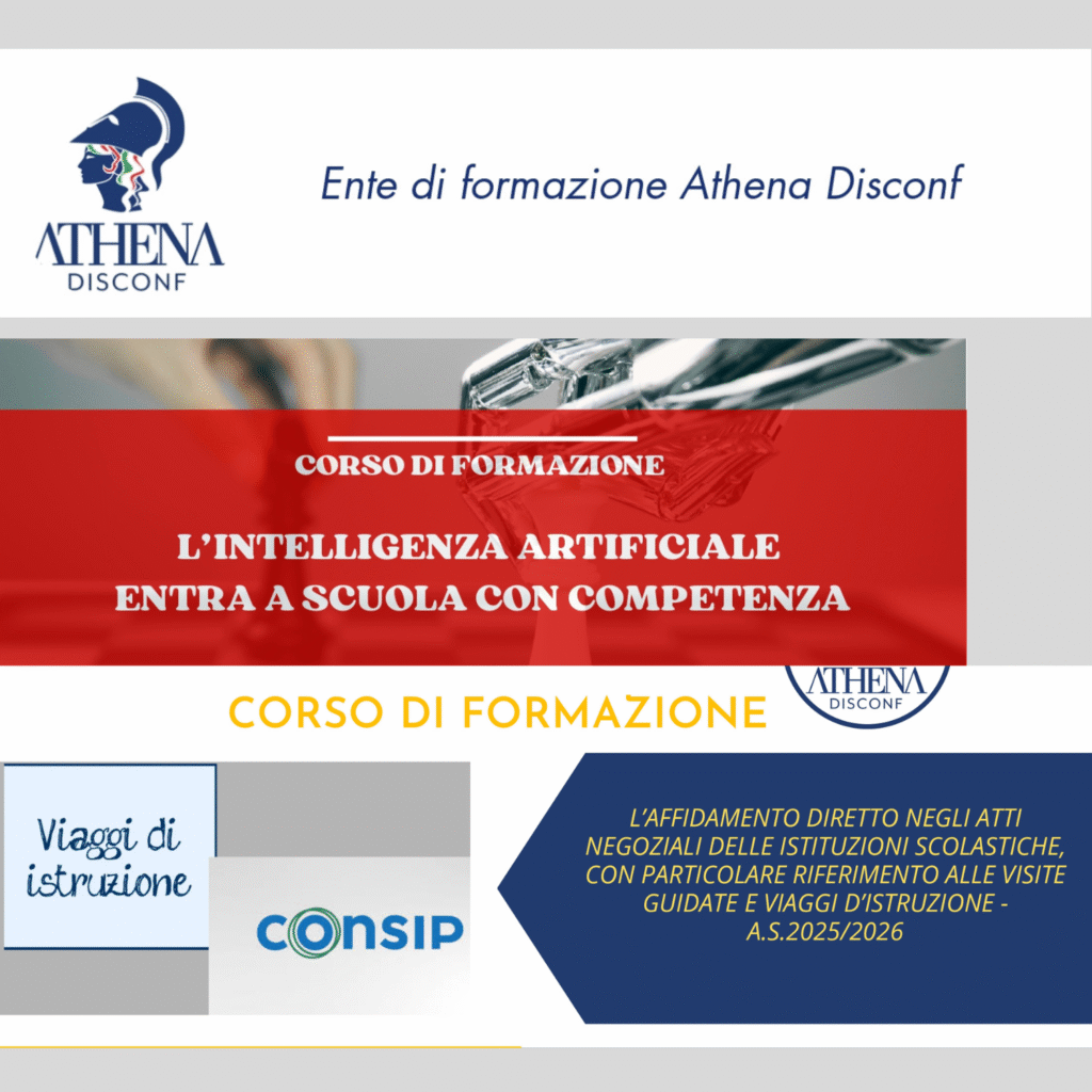 Come anticipato nei precedenti comunicati, i corsi Athena “L’Intelligenza Artificiale entra a scuola con competenza” e “L’affidamento diretto negli atti negoziali delle I.S., con particolare riferimento a visite guidate e viaggi d’istruzione – A.S. 2025/2026”, di imminente avvio nel mese di dicembre, sono disponibili sul Mepa – Mercato elettronico della pubblica amministrazione.