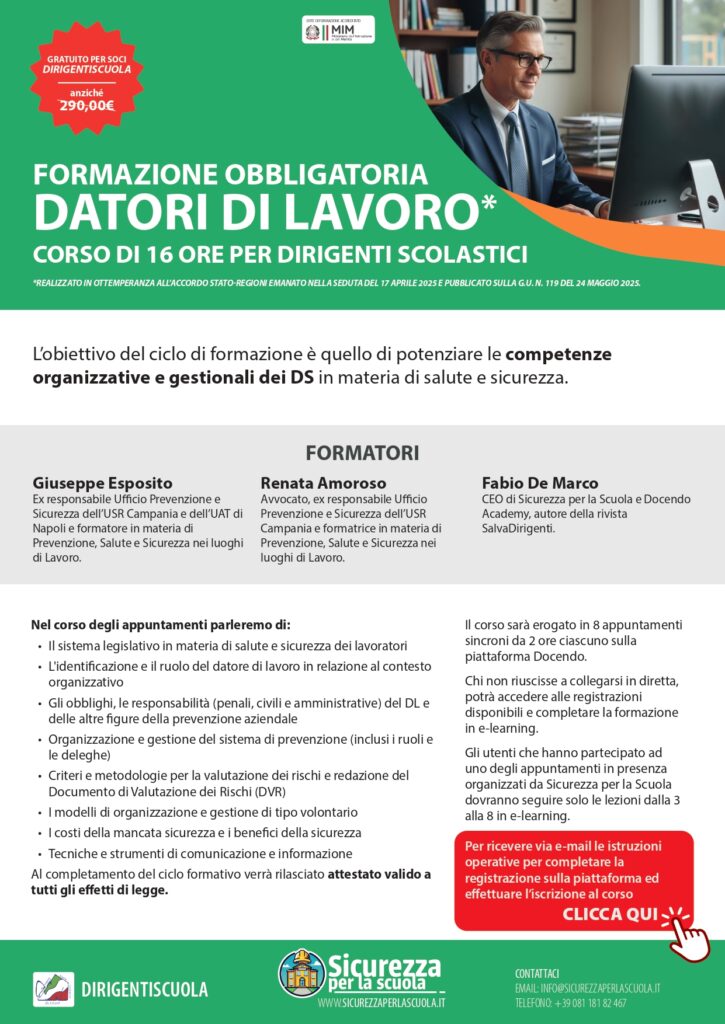 Domani, 26 febbraio 2026, si terrà un nuovo appuntamento del corso sulla Sicurezza “Formazione datori di lavoro”, in modalità FAD sincrona.