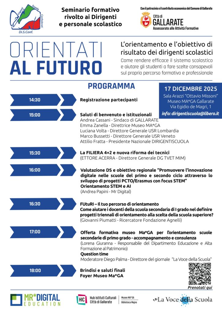 E’ tutto pronto per “Orientati al Futuro” il grande evento sull’orientamento scolastico organizzato da DIRIGENTISCUOLA al Museo MA*GA (via E. De Magri, 1 Gallarate – Va) in collaborazione con MR Digital e Hub Istituti Culturali Città di Gallarate, con il patrocinio e il contributo economico del Comune di Gallarate. Media partner la testata specializzata “La Voce della Scuola”. L’appuntamento è per il 17 dicembre, dalle 14.30 alle 18, nella prestigiosa cornice della Sala Arazzi Missoni del Museo. Il seminario formativo, rivolto a dirigenti e personale scolastico, affronterà il tema – di grande impatto – dell’orientamento fra i cicli scolastici e verso il mondo del lavoro, anche in relazione alle azioni che la scuola è chiamata a mettere in campo per rendere efficace il sistema scolastico ed aiutare gli studenti a fare scelte consapevoli sul proprio percorso formativo e professionale.