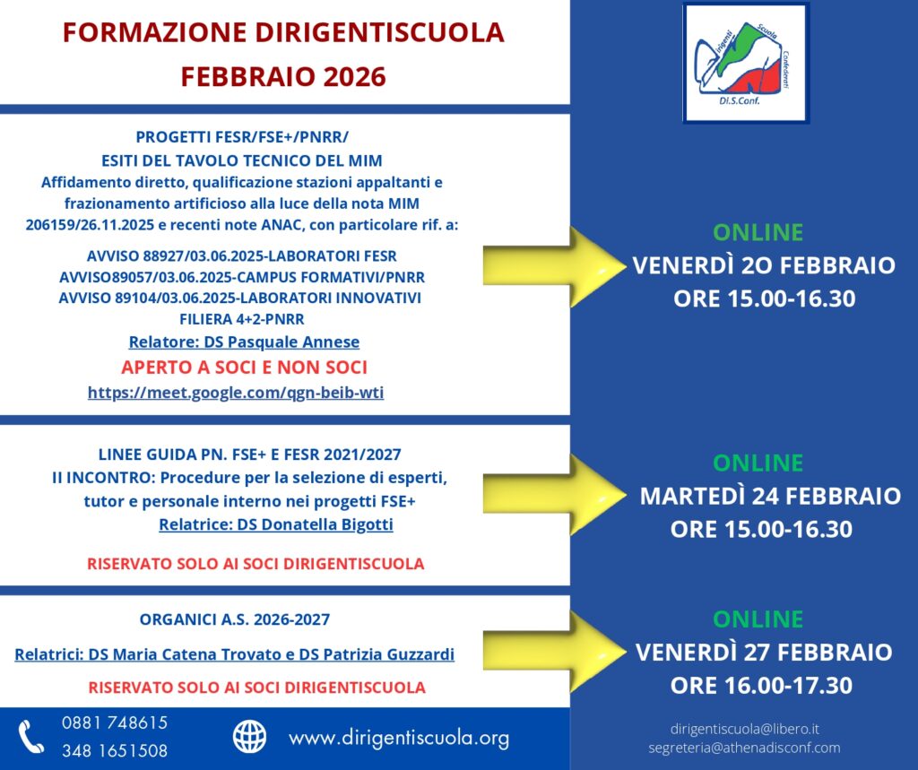• a seguito dell’apertura al MIM, il 16 febbraio scorso, del Tavolo Tecnico previsto dalla Conciliazione fra Ministero e Associazione, l’incontro online del 20 febbraio (ore 15-16.30)PROGETTI FESR/FSE+/ PNRR/ Esiti del Tavolo tecnico del MIM. Affidamento diretto, qualificazione stazioni appaltanti e frazionamento artificioso alla luce della nota MIM 206159/26.11.2025 e recenti note ANAC”, condotto dal DS Pasquale Annese, esperto e formatore in materia di affidamenti delle istituzioni scolastiche, sarà aperto anche ai non soci.