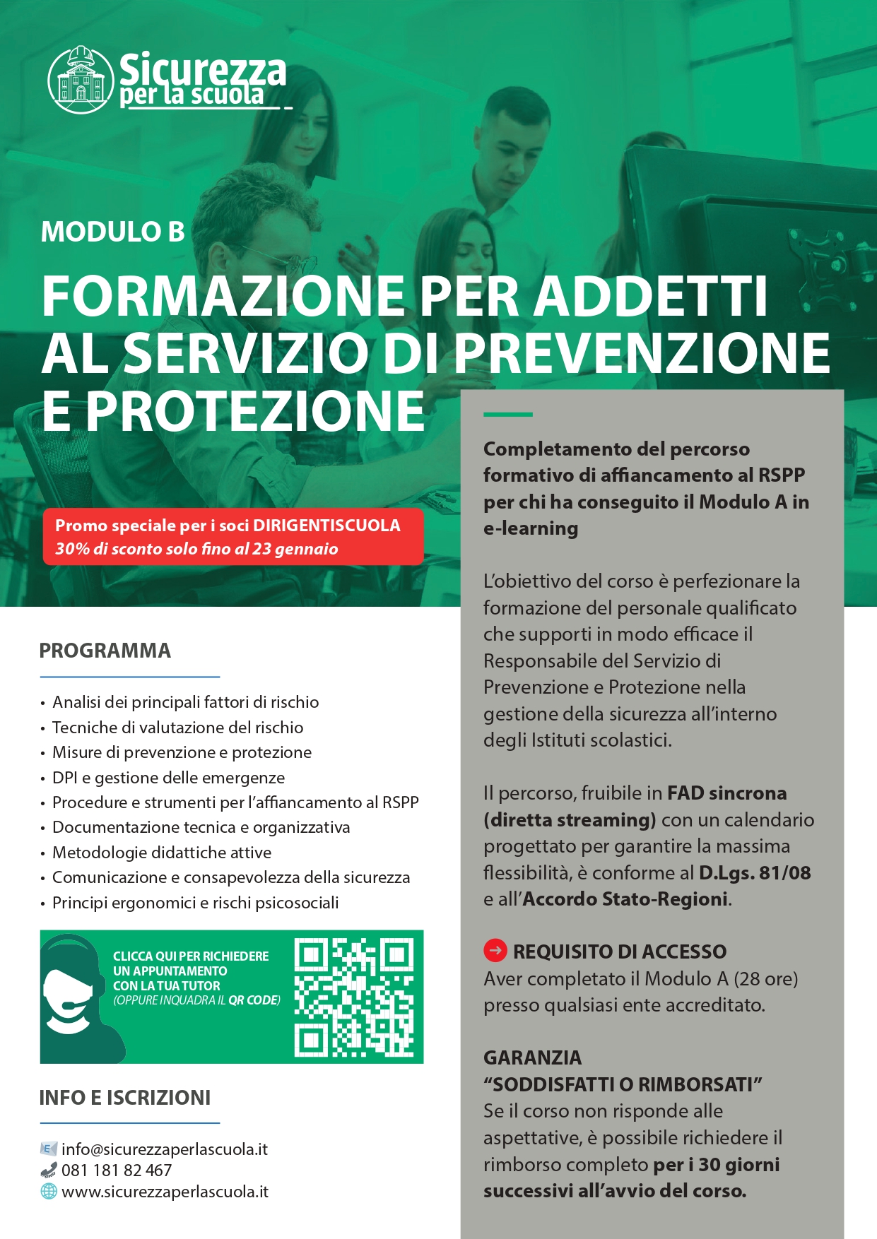 Per chi non avesse ancora frequentato il Modulo A, Sicurezza per la Scuola rende disponibile anche tale percorso, erogato con la medesima garanzia.