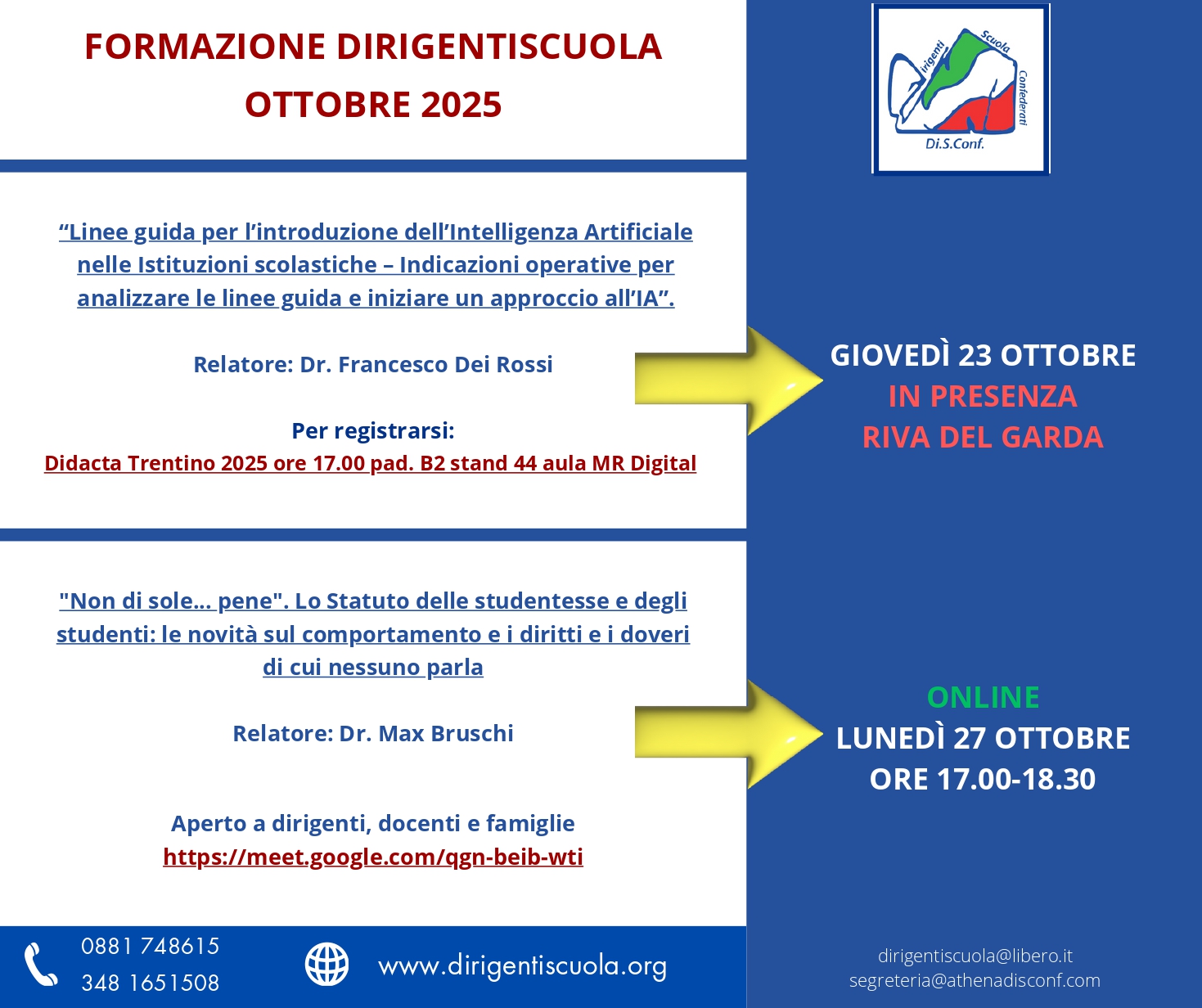 Sempre attenta all’attualità degli argomenti trattati nei propri incontri di formazione, DIRIGENTISCUOLA ha riprogrammato il tema del webinar previsto per lunedì 27 ottobredalle 17 alle 18.30 – con il dirigente tecnico Max Bruschi concentrandosi sulle novità relative al voto di condotta e allo Statuto delle studentesse e degli studenti in luogo delle Indicazioni nazionali I ciclo, come precedentemente annunciato, in attesa che la situazione su queste ultime si chiarisca dopo lo stop del Consiglio di Stato.