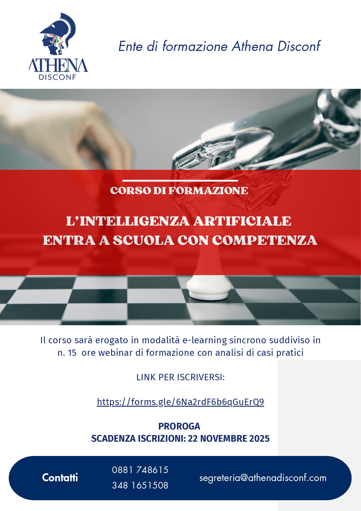 L’Ente di formazione Athena Disconf annuncia la proroga delle iscrizioni al 22 novembre per il corso “L’Intelligenza Artificiale entra a scuola con competenza”.