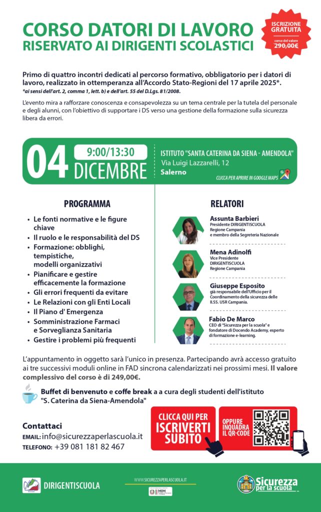 Tappa a Salerno per il corso sulla sicurezza che, parafrasando il claim di una nota rivista di enigmistica, “vanta innumerevoli tentativi di imitazione”! Parliamo naturalmente de “La sicurezza nelle Istituzioni Scolastiche. Responsabilità e adempimenti del Dirigente Scolastico”, realizzato da DIRIGENTISCUOLA in convenzione con Sicurezza per la Scuola. Il “save the date” è per il 4 dicembre, dalle 9 alle 13.30, all’Istituto S. Caterina da Siena – Amendola (via L. Lazzarelli, 12). Per la struttura campana saranno presenti la Presidente regionale Assunta Barbieri e la Vicepresidente Mena Adinolfi, che introdurranno la giornata facendo il punto sulle tematiche più attuali dell’attività associativa.