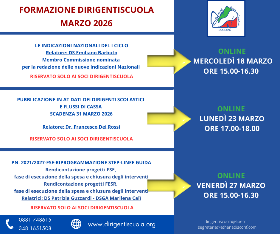Si tratta di un webinar, riservato ai soci, dal titolo “Pubblicazione in AT dati dei dirigenti scolastici e flussi di cassa”, dedicato appunto agli adempimenti relativi alla pubblicazione in Amministrazione Trasparente dei dati dei dirigenti scolastici e ai flussi di cassa, con particolare riferimento alla scadenza fissata al 31 marzo prossimo. La data dell’incontro è lunedì 23 marzo, l’orario dalle 17 alle 18. Relatore sarà Francesco Dei Rossi, noto formatore ed esperto DPO per diverse istituzioni scolastiche: l’appuntamento, che si inserisce nel corposo programma formativo di marzo, avrà l’obiettivo di fornire indicazioni operative utili alle istituzioni scolastiche per gestire correttamente gli obblighi di trasparenza amministrativa e contabile, chiarendo procedure, tempistiche e modalità di pubblicazione. Da non perdere.
