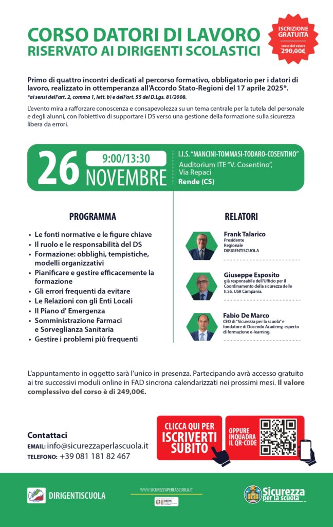 Dopo aver fatto letteralmente il giro della Penisola (Bari, Roma, Milano e Udine), il corso “La sicurezza nelle Istituzioni Scolastiche. Responsabilità e adempimenti del Dirigente Scolastico”, realizzato in convenzione con Sicurezza per la Scuola, arriva a Cosenza: l’appuntamento, primo di quattro dedicati al percorso formativo – obbligatorio per i datori di lavoro – realizzato in ottemperanza all’Accordo Stato-Regioni del 17 aprile scorso, è per mercoledì 26 novembre dalle 9 alle 13.30 all’Auditorium dell’IIS Mancini-Tommasi-Todaro-Cosentino di Rende (Cs), via Repaci.