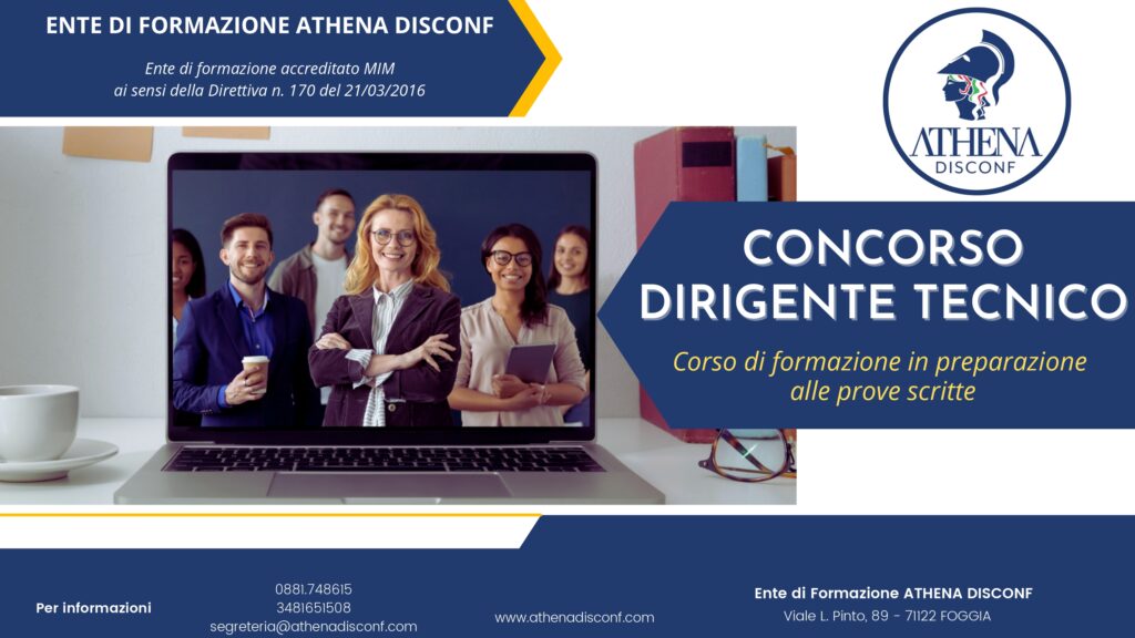 In continuità con il percorso formativo di qualità volto al superamento della prova preselettiva, l’Ente di formazione Athena Disconf organizza il corso “Preparazione alle prove scritte concorso dirigenti tecnici”, rivolto a dirigenti scolastici e personale docente ammessi agli scritti.