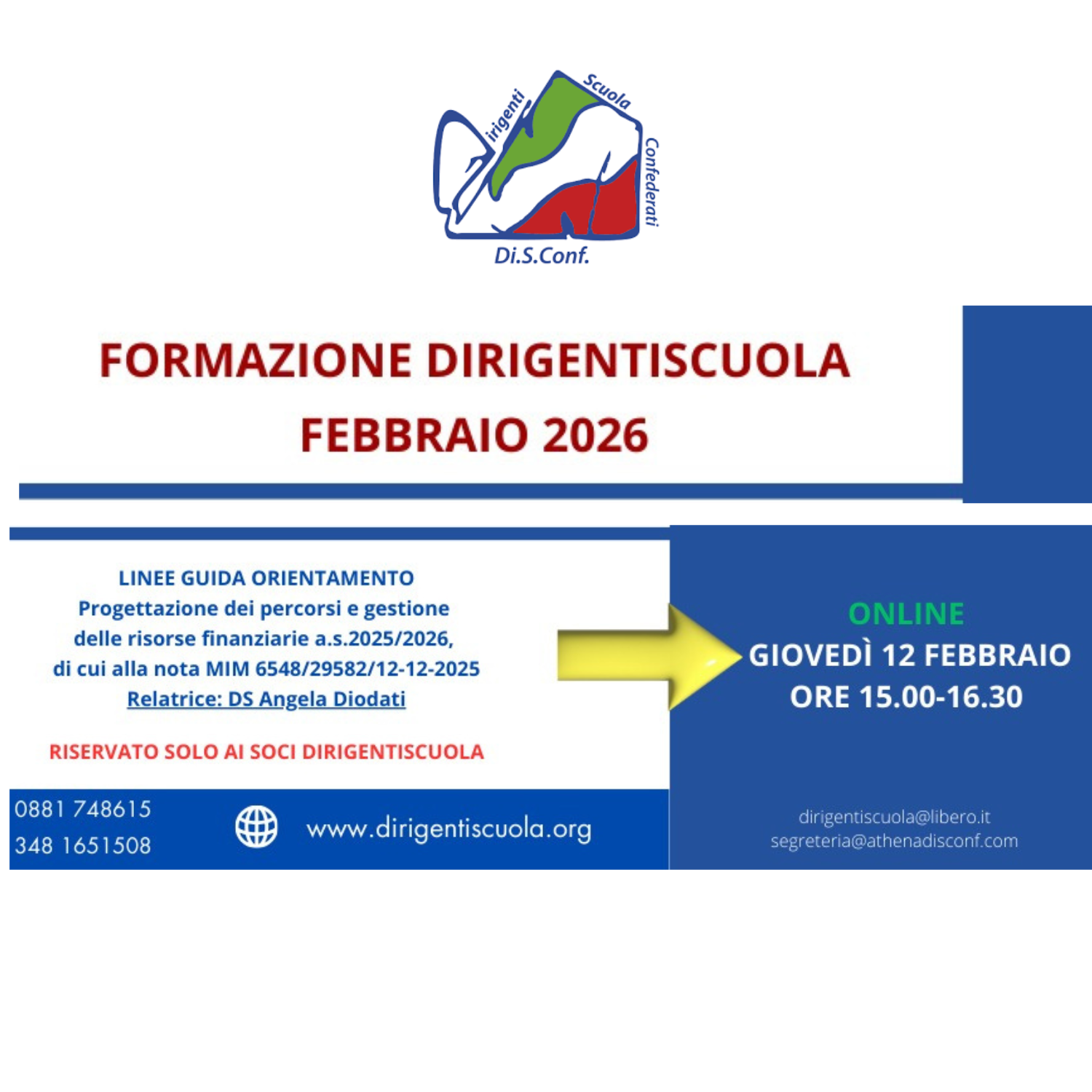 Oggi 12 febbraio, la dirigente Angela Diodati affronterà l’argomento : LINEE GUIDA SULL’ORIENTAMENTO-  progettazione dei percorsi formativi per l’anno scolastico in corso e  gestione strategica delle risorse finanziarie ad essi destinate, in ottemperanza alle precisazioni ministeriali di dicembre 2025.